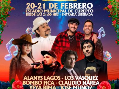 Región Municipalidad de Curepto confirma la parrilla oficial del Festival de la Camelia en su 40ª edición Carlos Narea y Los Vásquez abrirán el 20 de febrero; Alanys Lagos y el humor ...
